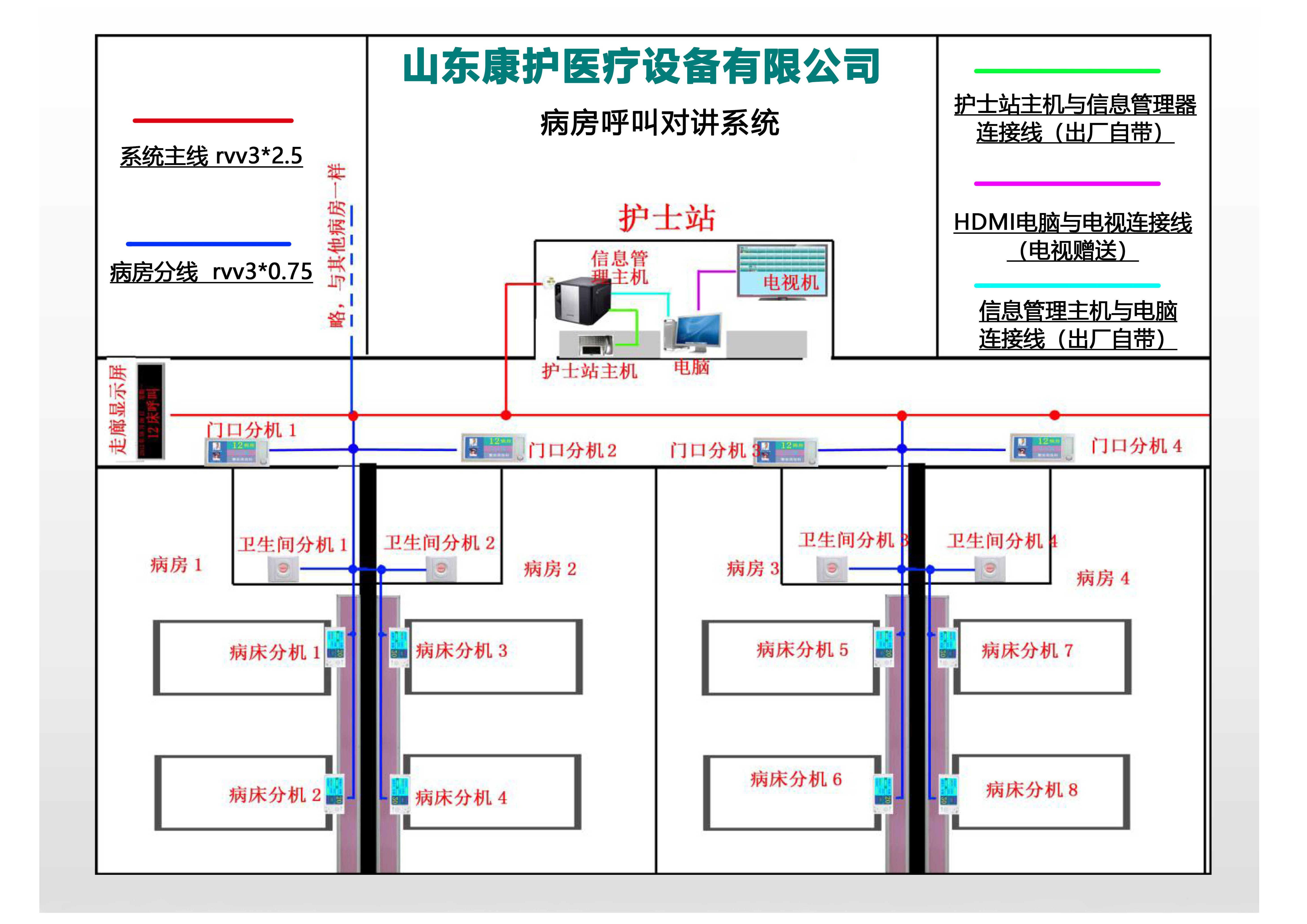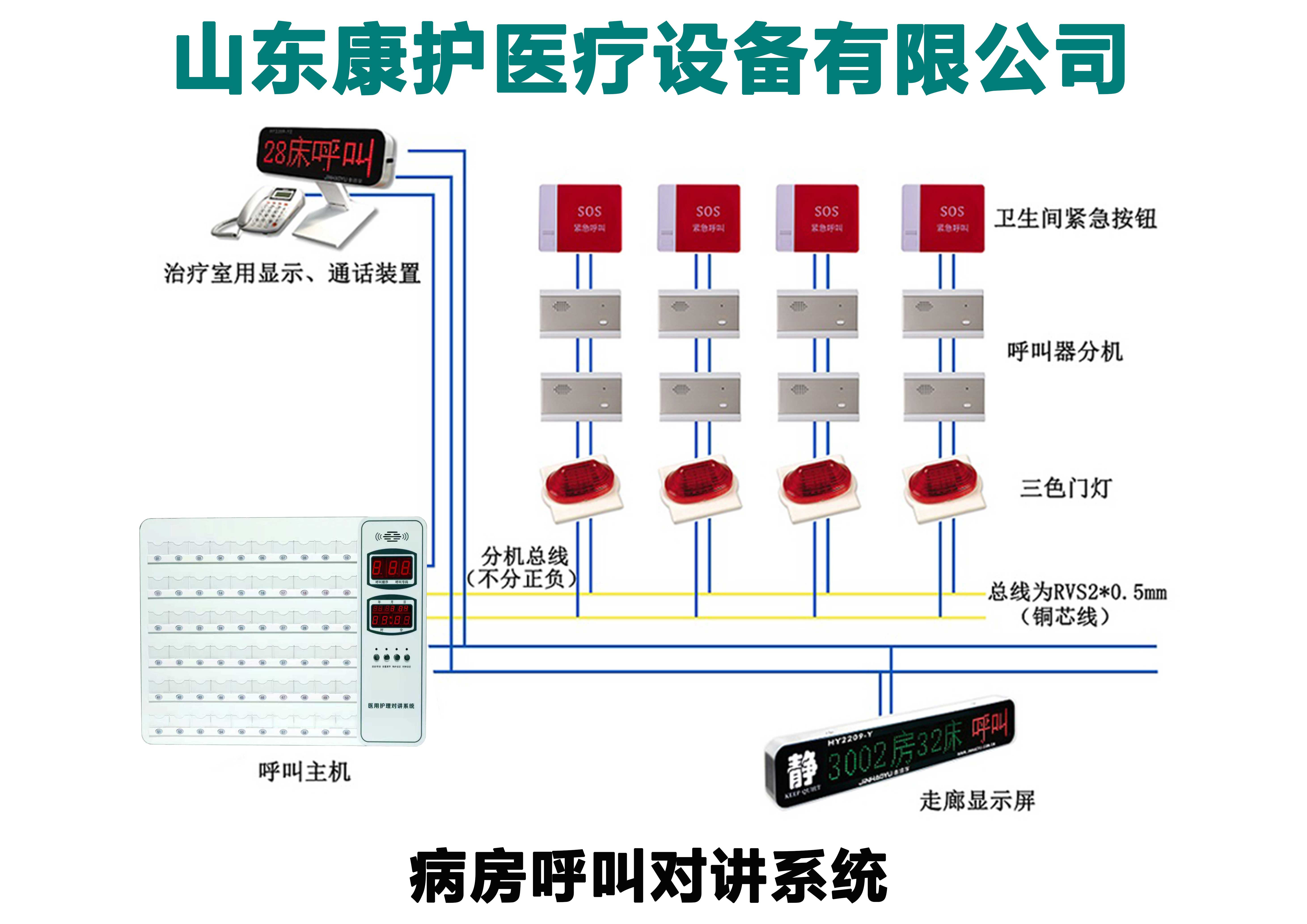 这种病房呼叫器布线为三芯线,用普通电源线就可以传输,具体布线方式如上图所示,此种呼叫系统为智能病房呼叫系统,床头分机为液晶屏幕,可以显示更多信息,也可以连接his系统。布线简单,价格相比智慧病房系统便宜一些也。